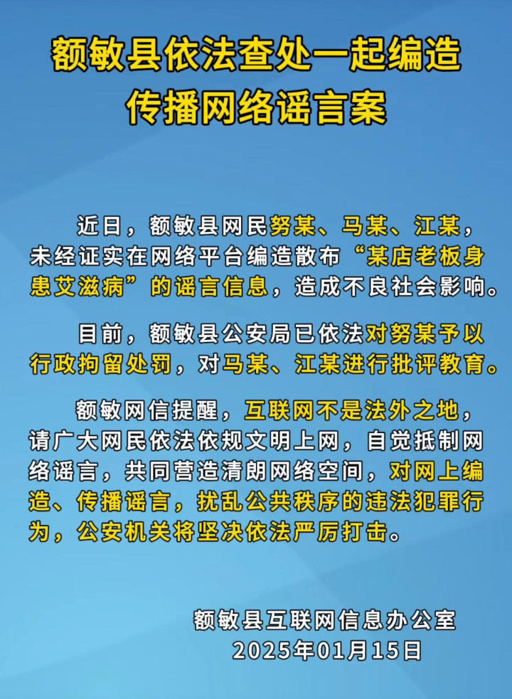 南都湾财社记者注意到,针对此事,近日网信额敏官方公众号已发布通报。额敏县互联网信息办公室1月15日发布的通报显示,相关部门依法查处一起编造传播网络谣言案,具体来看,近日,额敏县网民努某、马某、江某,未经证实在网络平台编造散布“某店老板身患艾滋病”的谣言信息,造成不良社会影响。目前,额敏县公安局已依法对努某予以行政拘留处罚,对马某、江某进行批评教育。